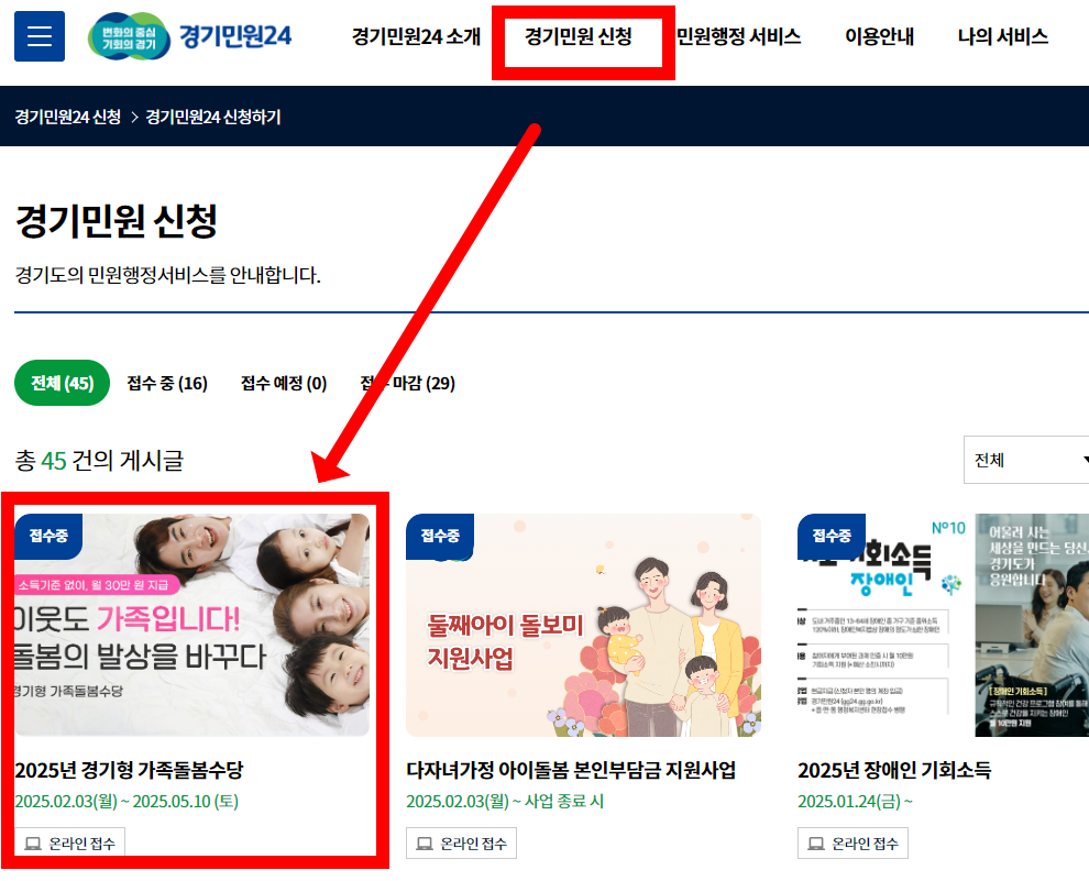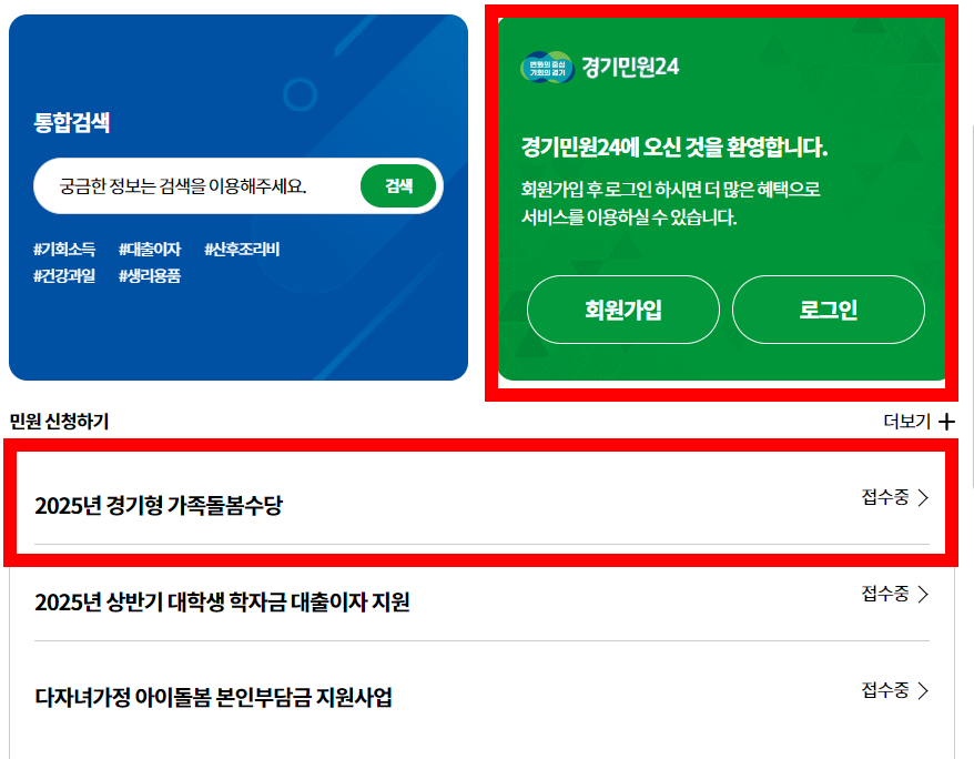 가족돌봄수당은 경기민원24 사이트에서 온라인 신청이 가능하니 편하게 집에서 신청하세요!