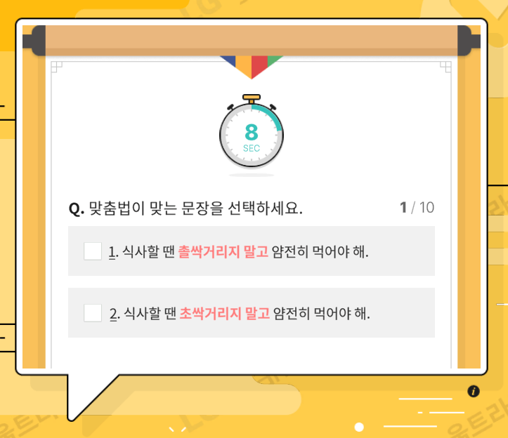 저는 개인적으로 사가 게임보다 이런 기초적인 퀴즈 게임이 더 재밌었습니다. 그리고 맞춤법 퀴즈는 성인 기준에도 헷갈리는 문제들이 많아 시시하지 않고 의외로 재밌습니다.