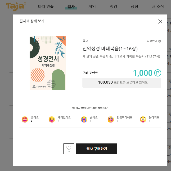 그런데 복음서마다 1,000원 유료 결제를 해야 해서 비용이 부담되시는 분들도 있을 것 같습니다. 이 경우 아래의 무료 성경통독 사이트에서 무료로 필사가 가능하니 참고하세요!