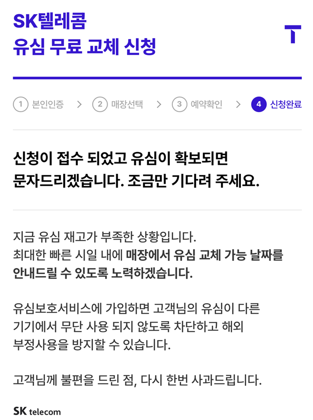 SKT 유심 무료 교체는 비대면으로는 불가하기 때문에, 반드시 SKT 매장에 방문해서 교체를 받아야 합니다.