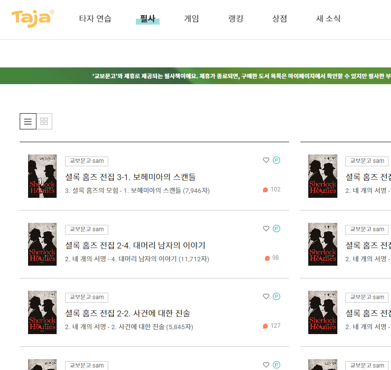 셜록홈즈 소설, 수필, 시 등 수백 편의 문학작품을 제공하고 있는데, 작품마다 가격이 매겨져있어서 유료 결제 후 필사가 가능합니다.